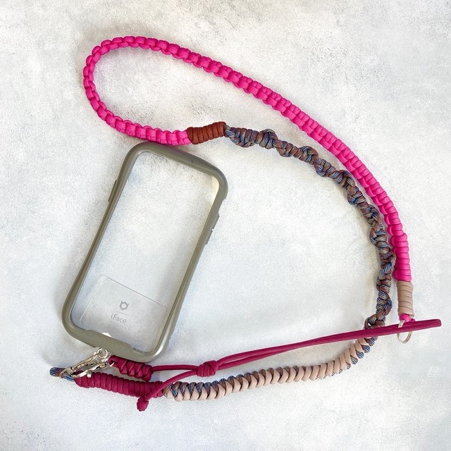 パラコードスマホショルダーストラップ ピンク×ブラウン×ワインレッド 他カラー・・・https://koyuan.base.shop/categories/5259695 ちょうどいい存在感の、アクセサリー感覚で使える スマホ用ショルダーストラップです* 他と被らないかわいいスマホショルダーが欲しい という思いから生まれました! 肩にかけた時、前後で印象が変わるように 配色・デザインをしているので、2パターンで楽しめます。 カジュアル、シンプル、スポーティーなファッションが お好きな方に特におすすめです! 普段使いはもちろんですが、 ・ポケットがないお洋服の時 ・スマホ落下・紛失防止に ・旅行やレジャーの際 などに便利です。 素材は7芯のパラコードを使用し、 色んな編み方で一つ一つしっかり編んでいます。 パラコードはパラシュートを吊るすために作られたコードで 丈夫で軽い素材です。 重さは気にならないくらい軽く、 ある程度幅もあるので、肩への負担が少なく 使用していただけると思います。 細い部分の結び目をつまんで引っ張ることで 長さ調節もできるように作っているので、 首からかけても、肩から斜めにかけても快適な長さになっています* それでも短い・長い場合の調節方法をInstagramに 動画で掲載していますのでそちらもご覧ください^^ サイズ・・・全長約130cm~140cm 商品に関して ・着用画像はイメージです。 ・スマホショルダーのみの販売です。ケースは付属しておりません。 ・お手持ちのケースにストラップホルダー(オプション150円で販売中)を使用して取り付けて下さい。 ※ケースが軟らかいものの場合、外れる場合があります! ・長さの調整ができます。結び目をつまみ、左右に引っ張って下さい。 ・洗濯用洗剤などで手洗いが可能です。 ・ハンドメイドの作品です。サイズに個体差が生じる場合があります。 使用上の注意 ・強く引っ張たり振り回すと故障や事故の原因になりますのでご注意ください。 ・首や肩から吊り下げて使用する際は、首に絡んだり、ひっかけたり、巻き込まれたり他の物にぶつけないよう安全にご注意ください。 ・お子様やペットの手の届かない所で使用保管してください。 ・本来の用途(スマホショルダー)以外に使用しないでください。 ・使用中に起こった事故や、スマートフォンの破損や故障に関して一切の責任を負いかねますので予めご了承下さい。 【その他】 営業時間:9:00~16:30 定休日:土日、年末年始 入金確認後5日以内に商品を発送いたします。 発送の際、リサイクルの梱包材を使用させていただく場合がございます。予めご了承ください。